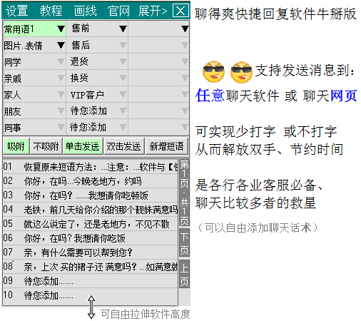 聊得爽快捷回复软件牛掰版是一款免费支持微信、企业微信/QQ、淘宝千牛/旺旺、拼多多聊天、浏览器网页、